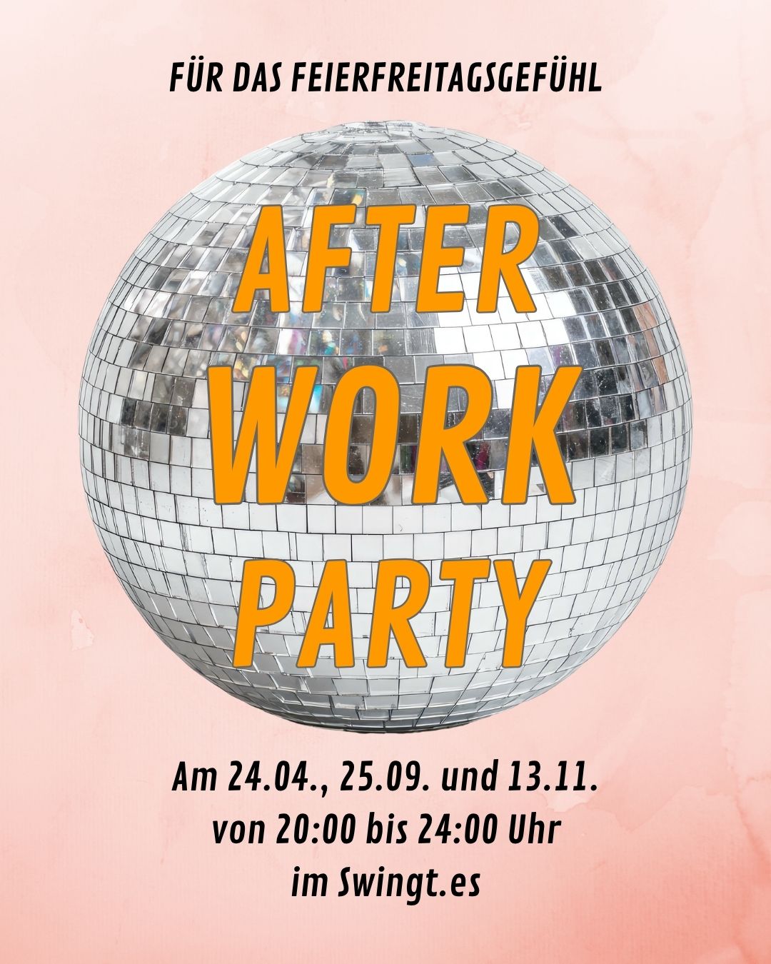 Die After-Work-Tanzgelegenheit, um entspannt ins Wochenende zu starten. Mit vorwiegend populärer Musik lädt diese Party ausdrücklich alle Tanzenden ein – egal, ob Swing oder Freestyle begeistert. Alles, was Puls hat und tanzbar ist, läuft über die Plattenteller – schließlich ist die DJane selbst eine Lindy-Hop-Begeisterte erster Güte und sorgt für echtes Discofeeling im Swingt.es